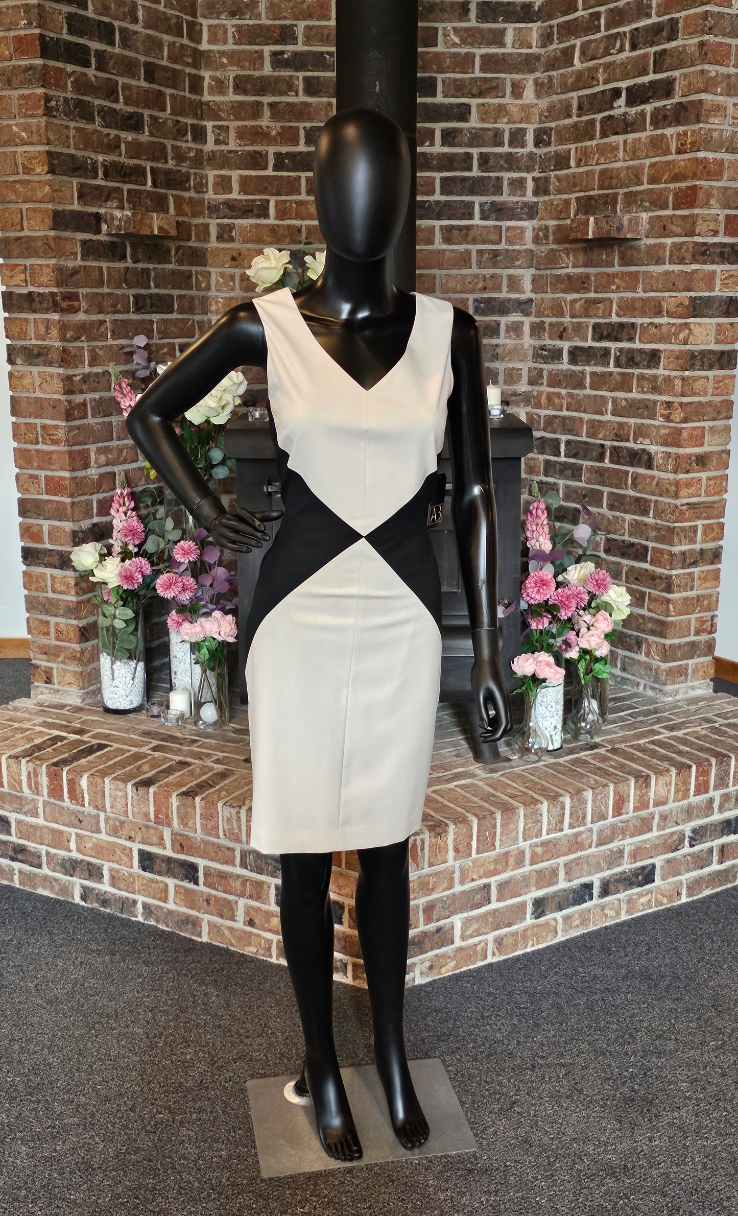 This Black/Ivory Diamond Sheath dress boasts a stunning inverted Black/White Diamond design along the waistline, creating a flattering shape. With a sophisticated v-neckline and sleeveless sheath style, this dress is the perfect combination of elegance and modern design. Elevate your wardrobe with this one-of-a-kind dress.