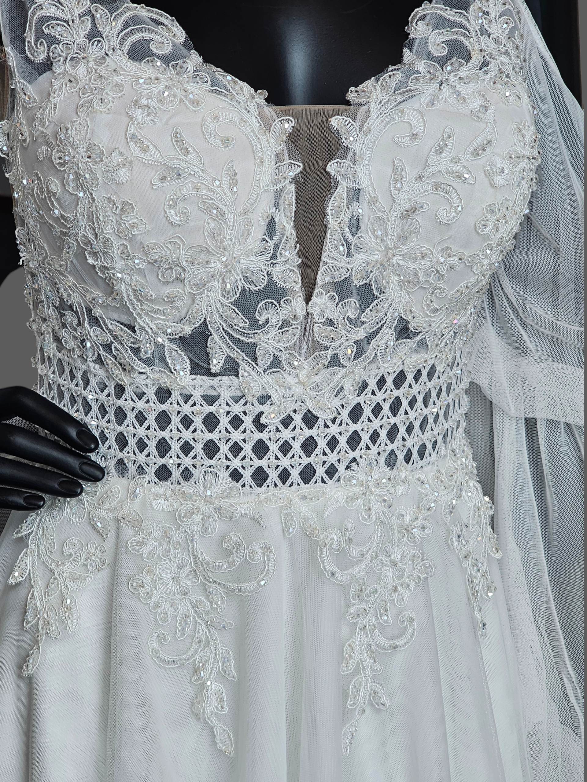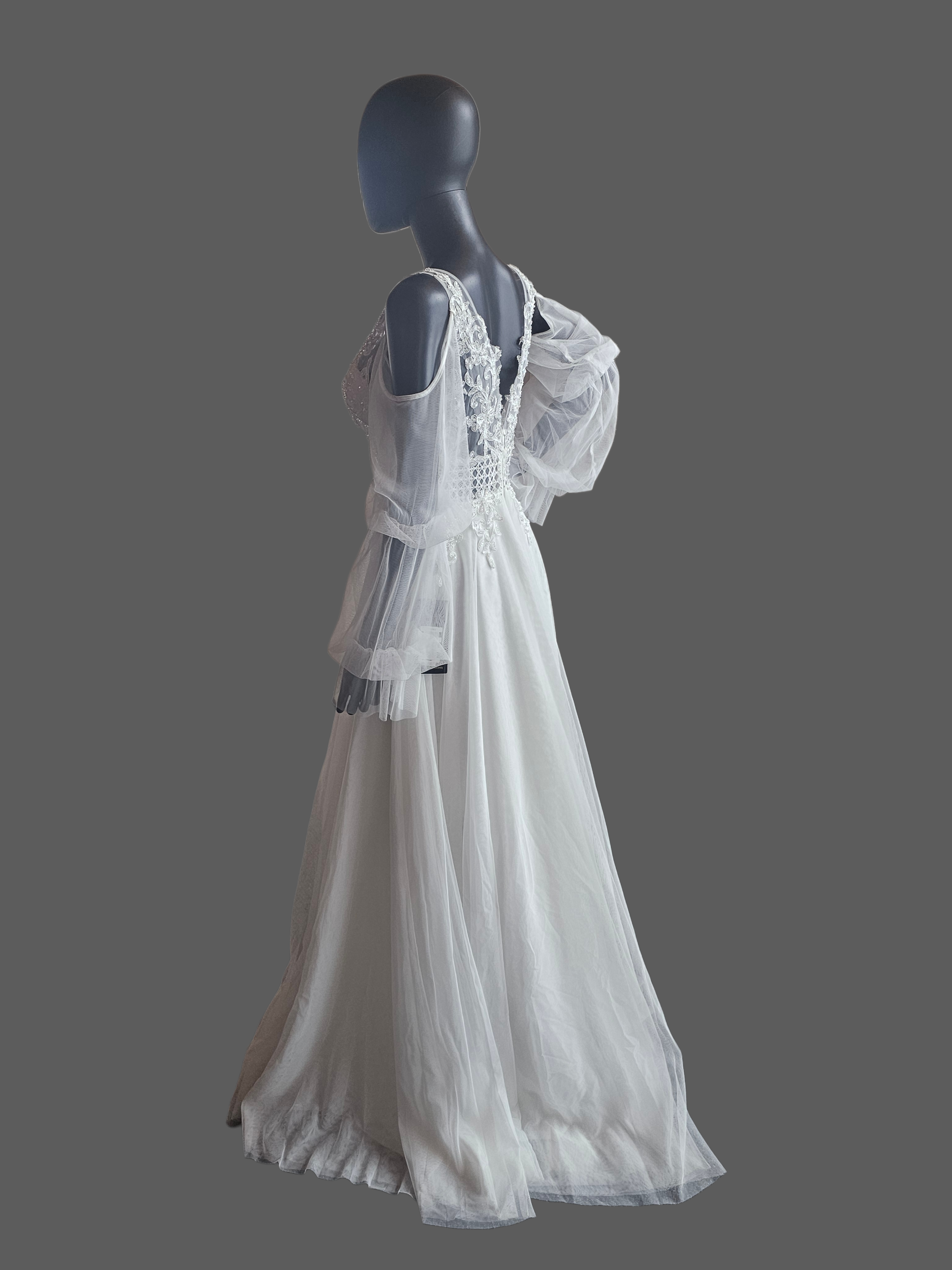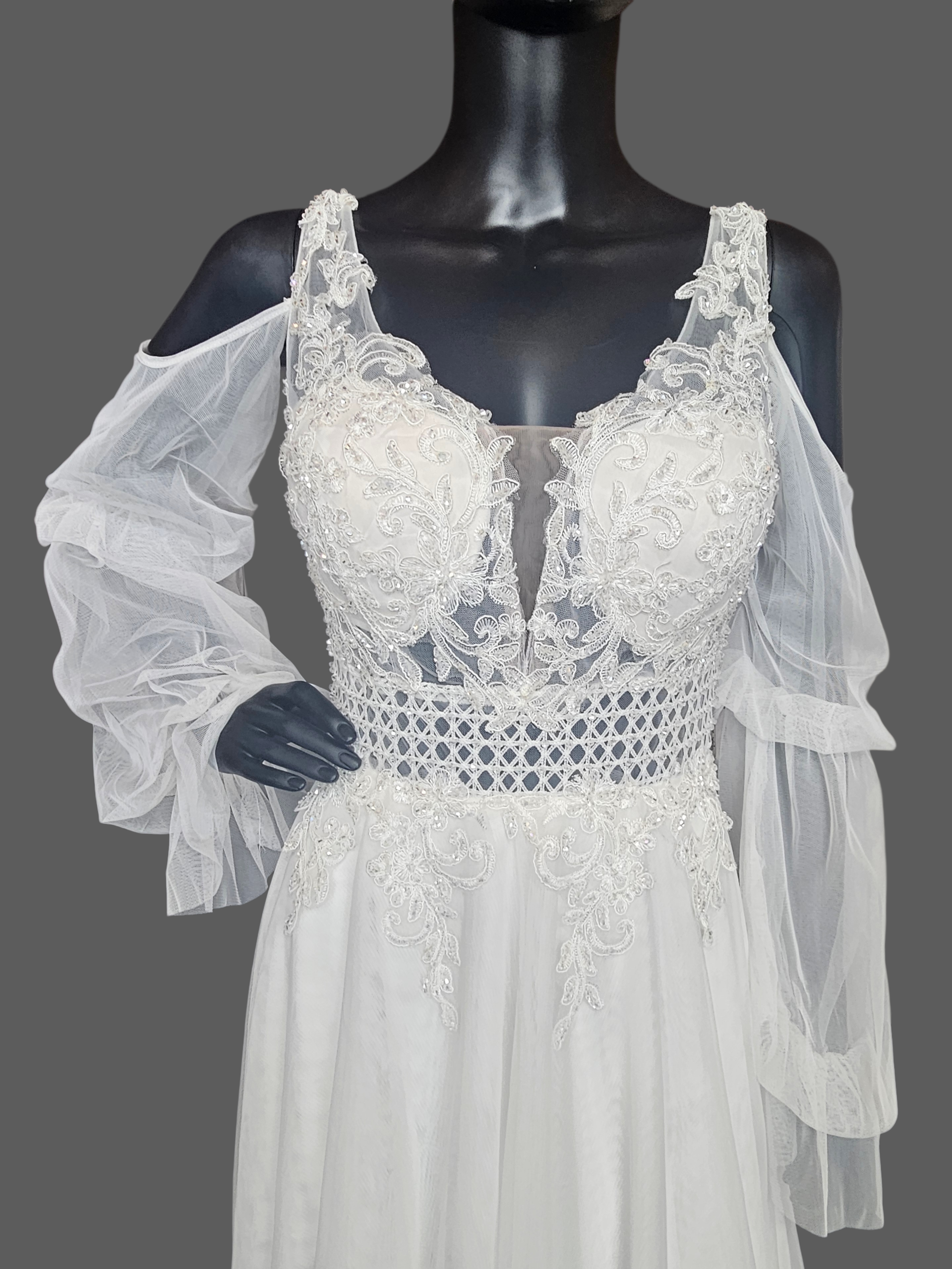 Ivory Boho V-Neck Cold Shoulder Lantern Sleeve Wedding Gown - Niobe - NWT