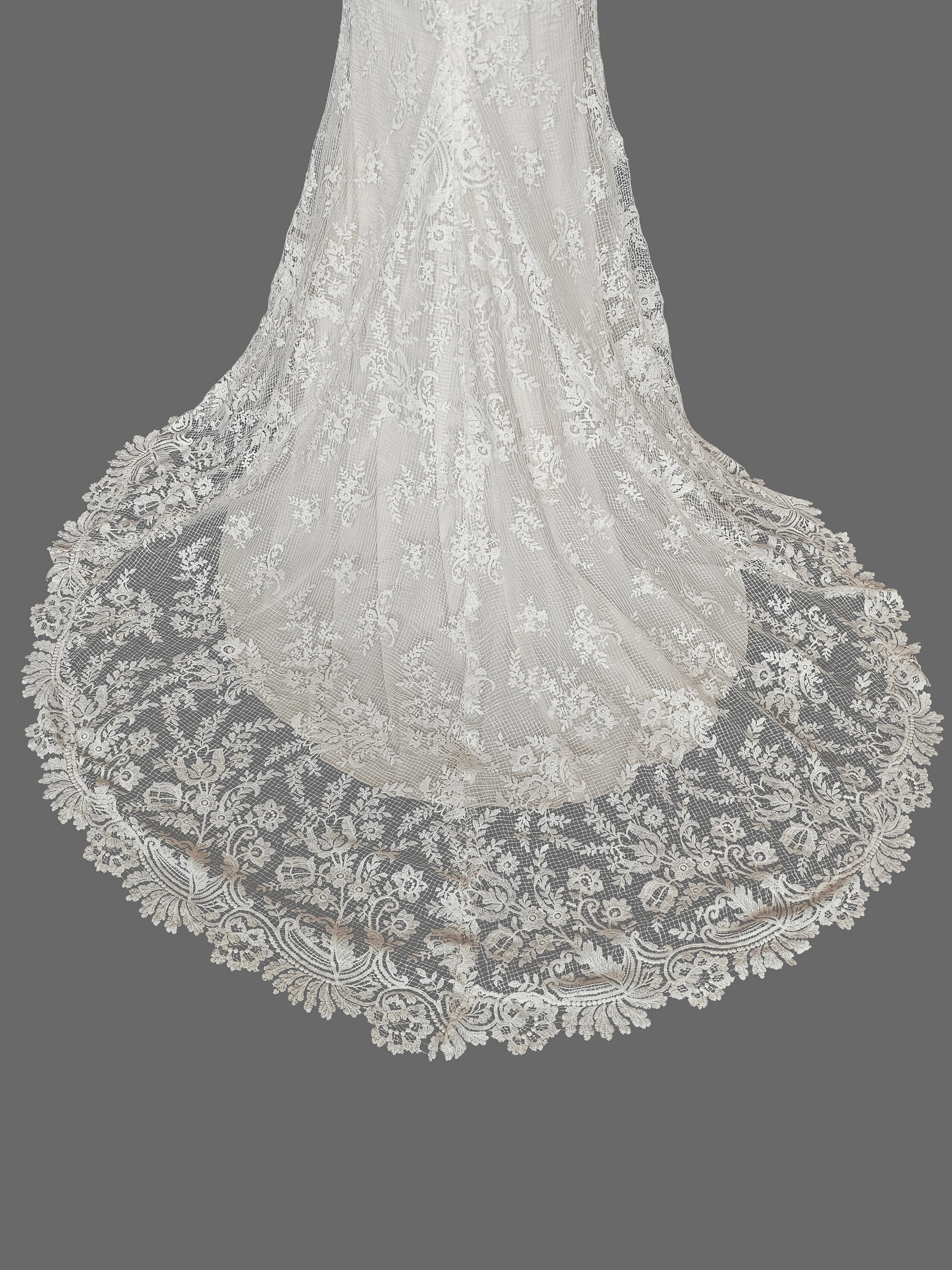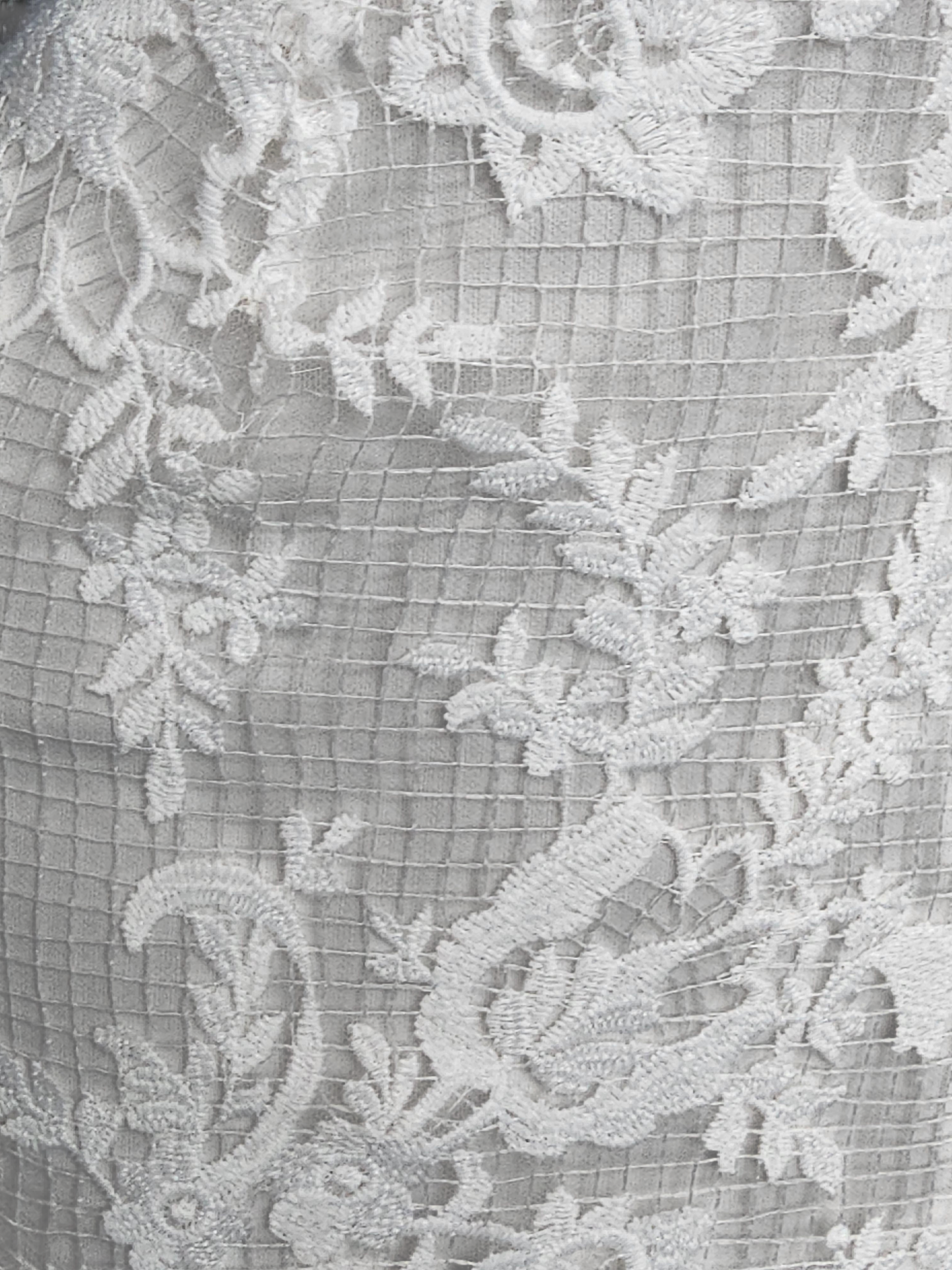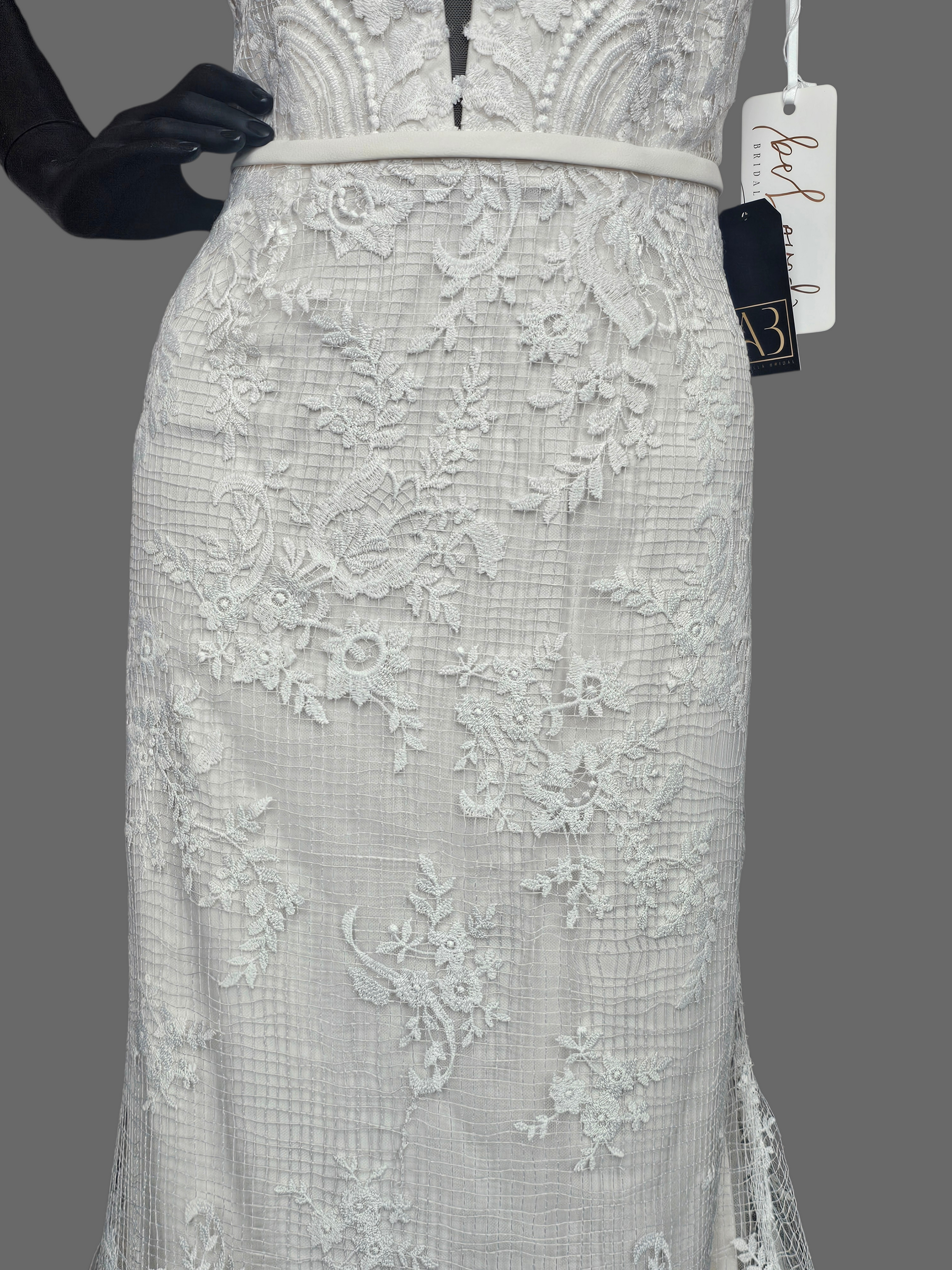 Please note: This is a brand new/never worn store sample however this fabric is incredibly delicate. There are some signs of wear along the hips at the seam from being tried on. The loose threads can be rewoven or tied off during alterations.