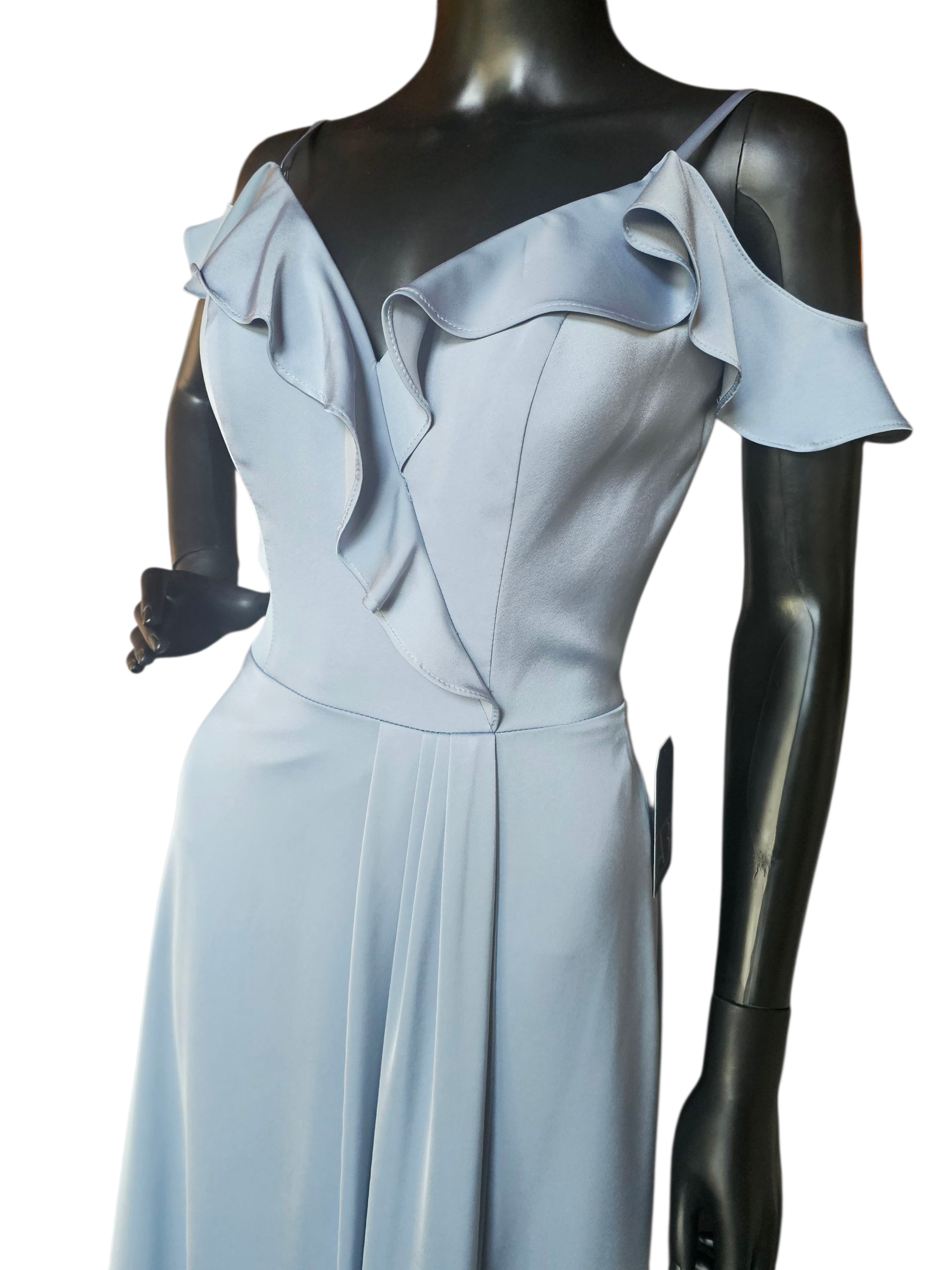 Dusty Blue Soft Satin Flutter Sleeve Full Length Formal Dress - Da Vinci
