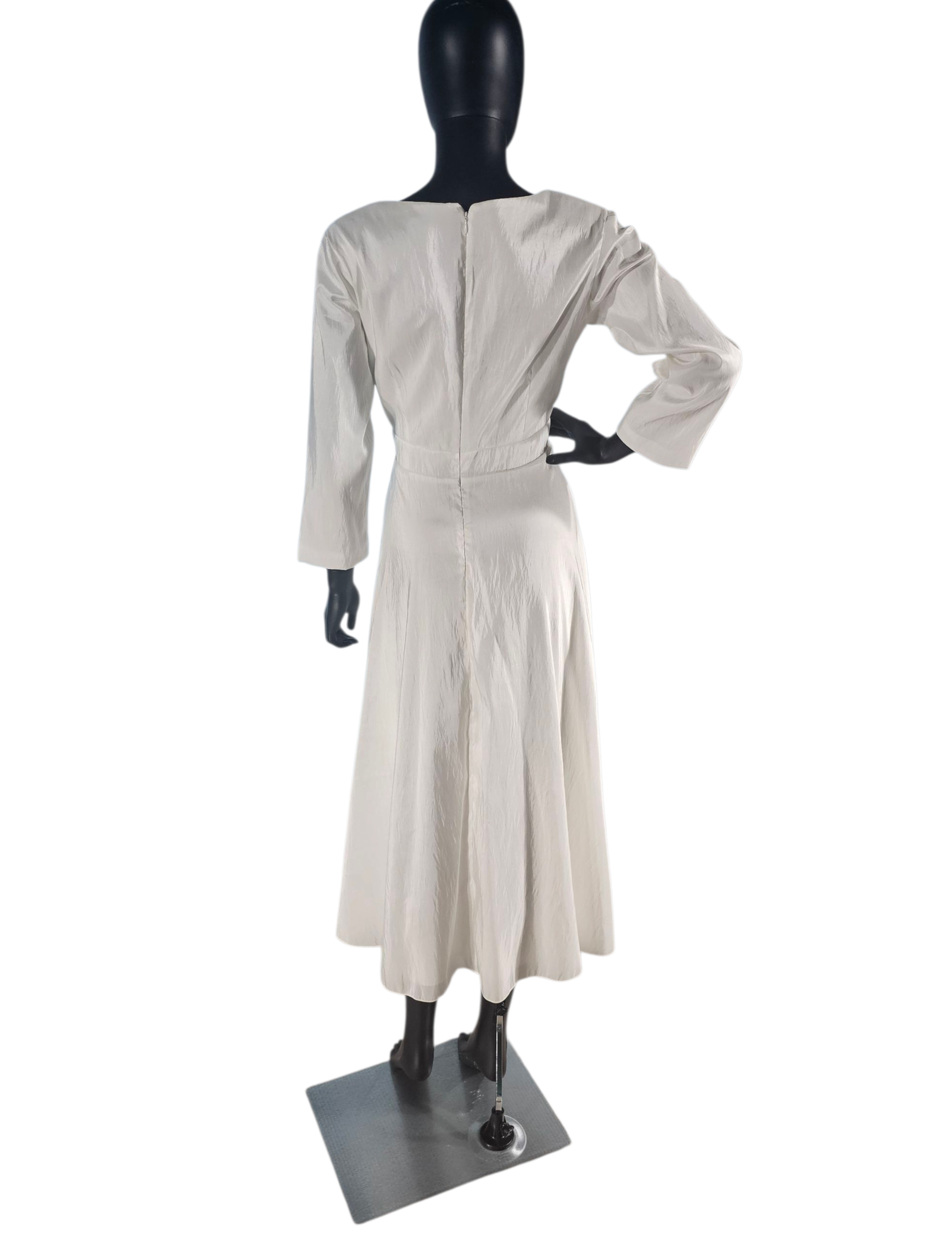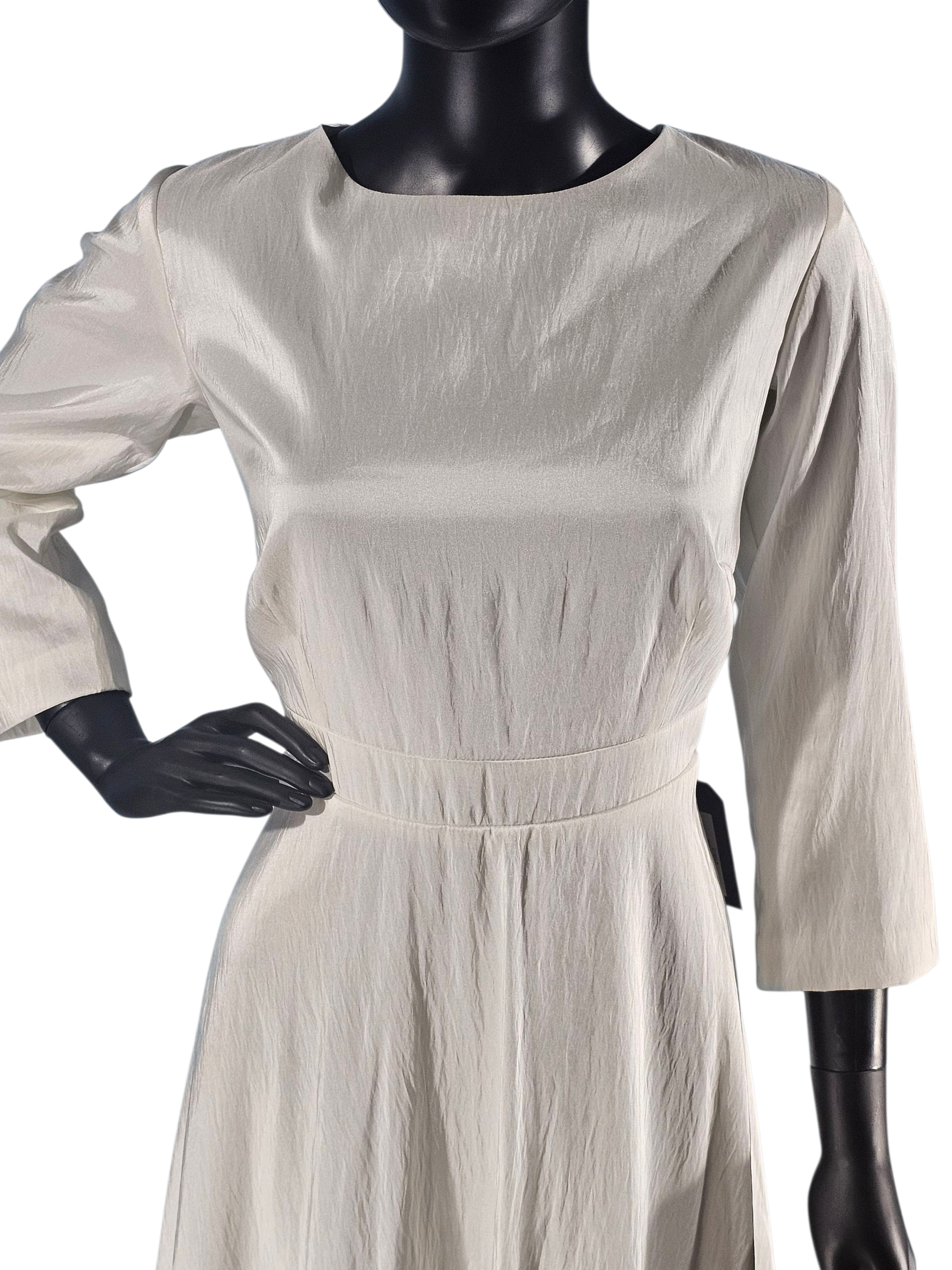 This simple, chic tea length gown is perfect for a backyard event or romantic beach day. The 3/4 length sleeves allow easy movement and airflow while drawing back to the accentuated waistline. This dress is modest and sophisticated with it's beautiful sleeve and skirt lines.