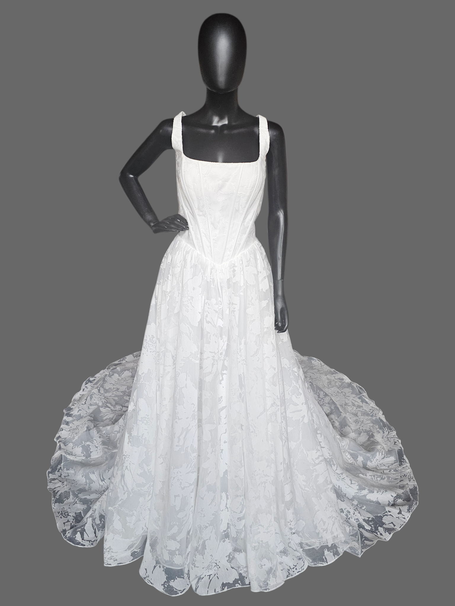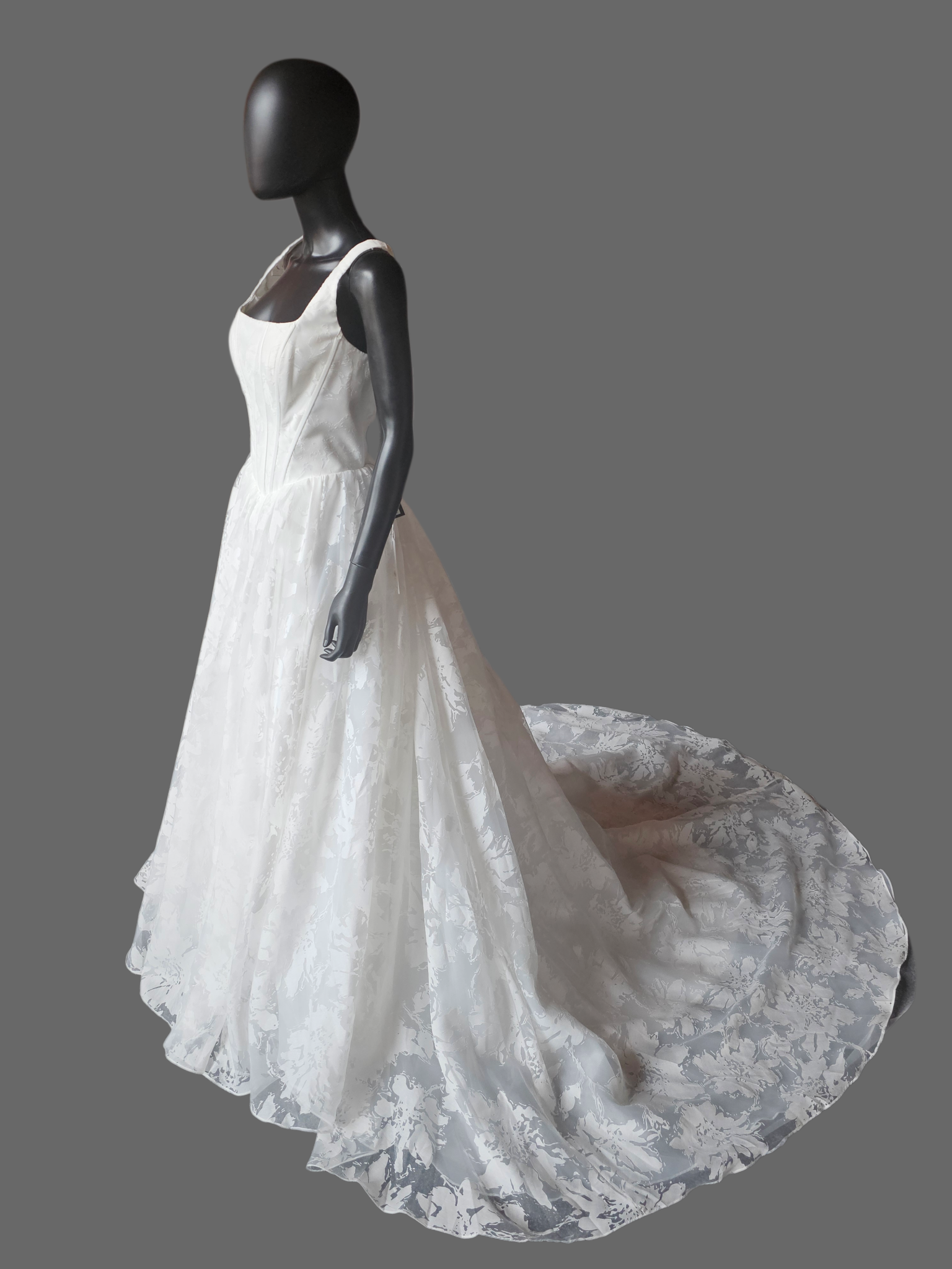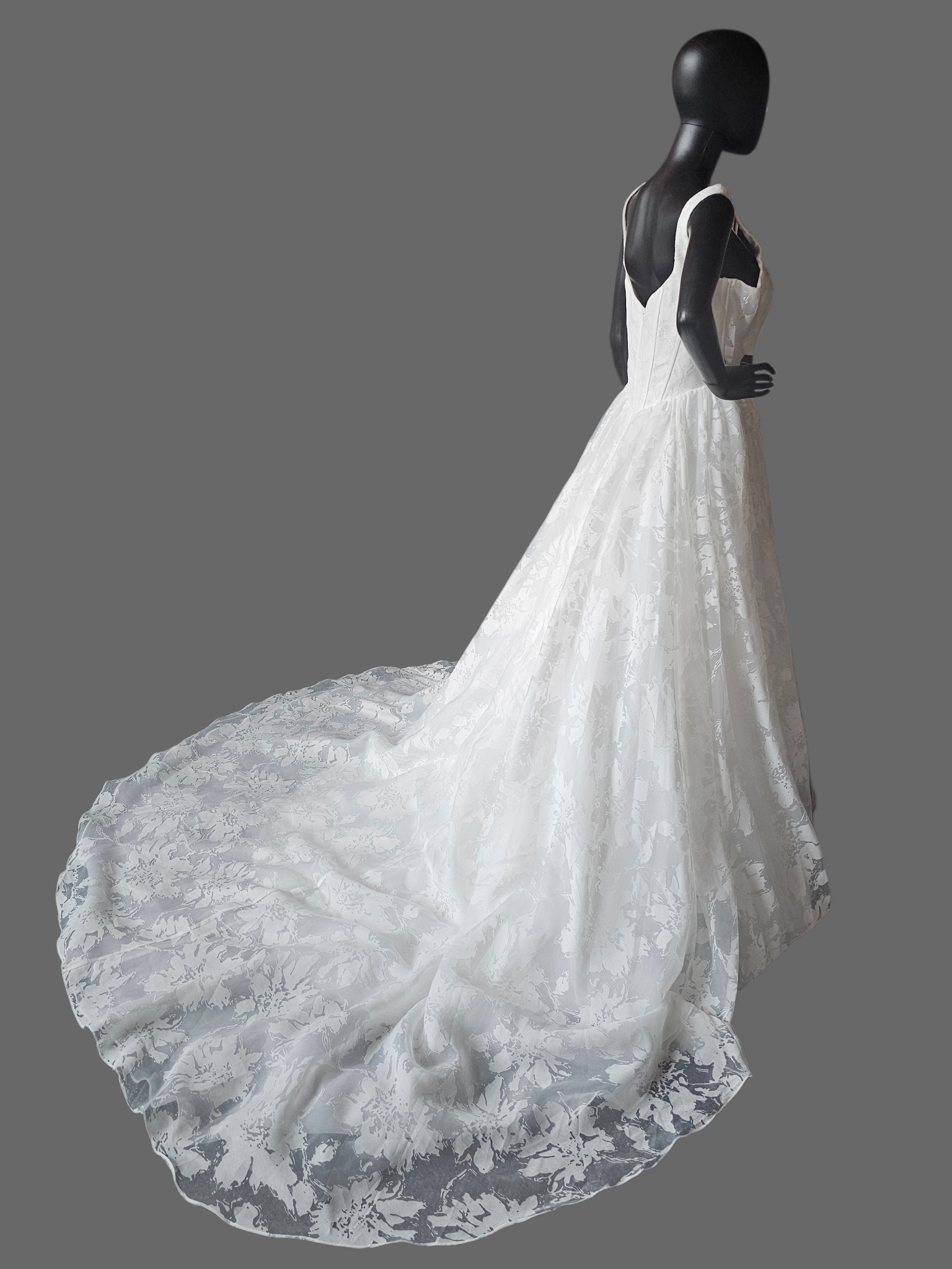 Ivory Floral Burnout Basque Waist Square Neckline Wedding Gown - Tania Olsen NWT