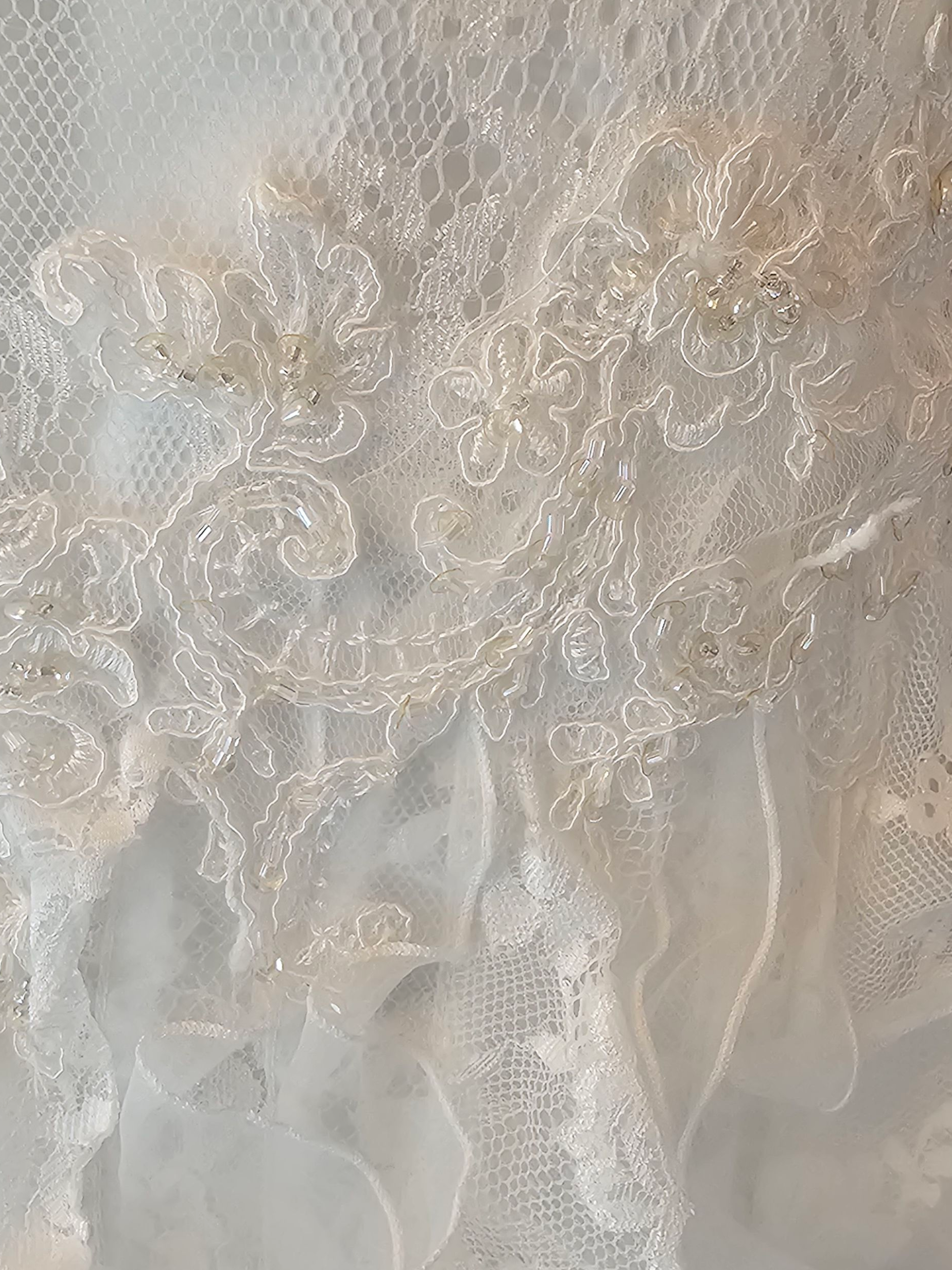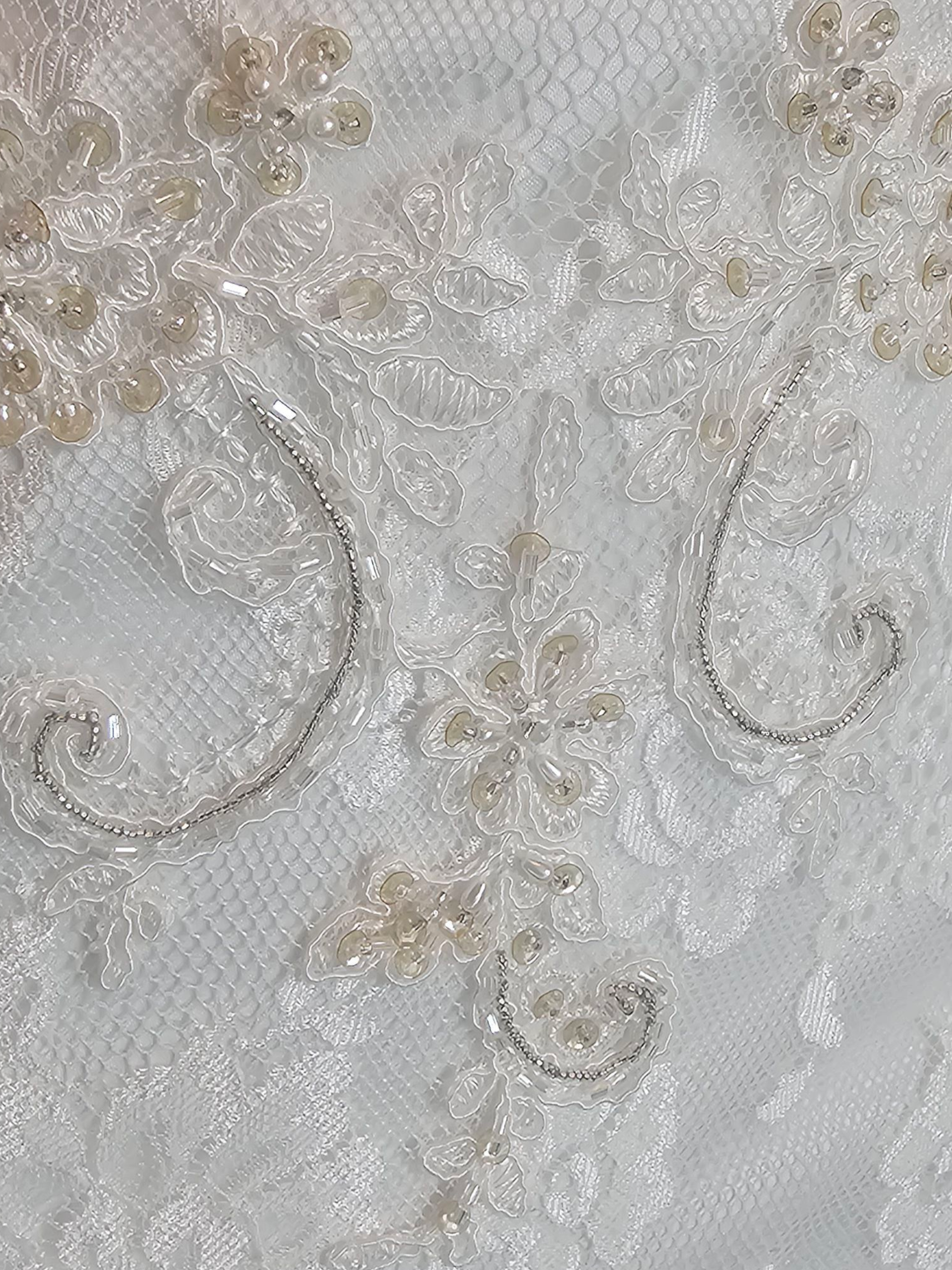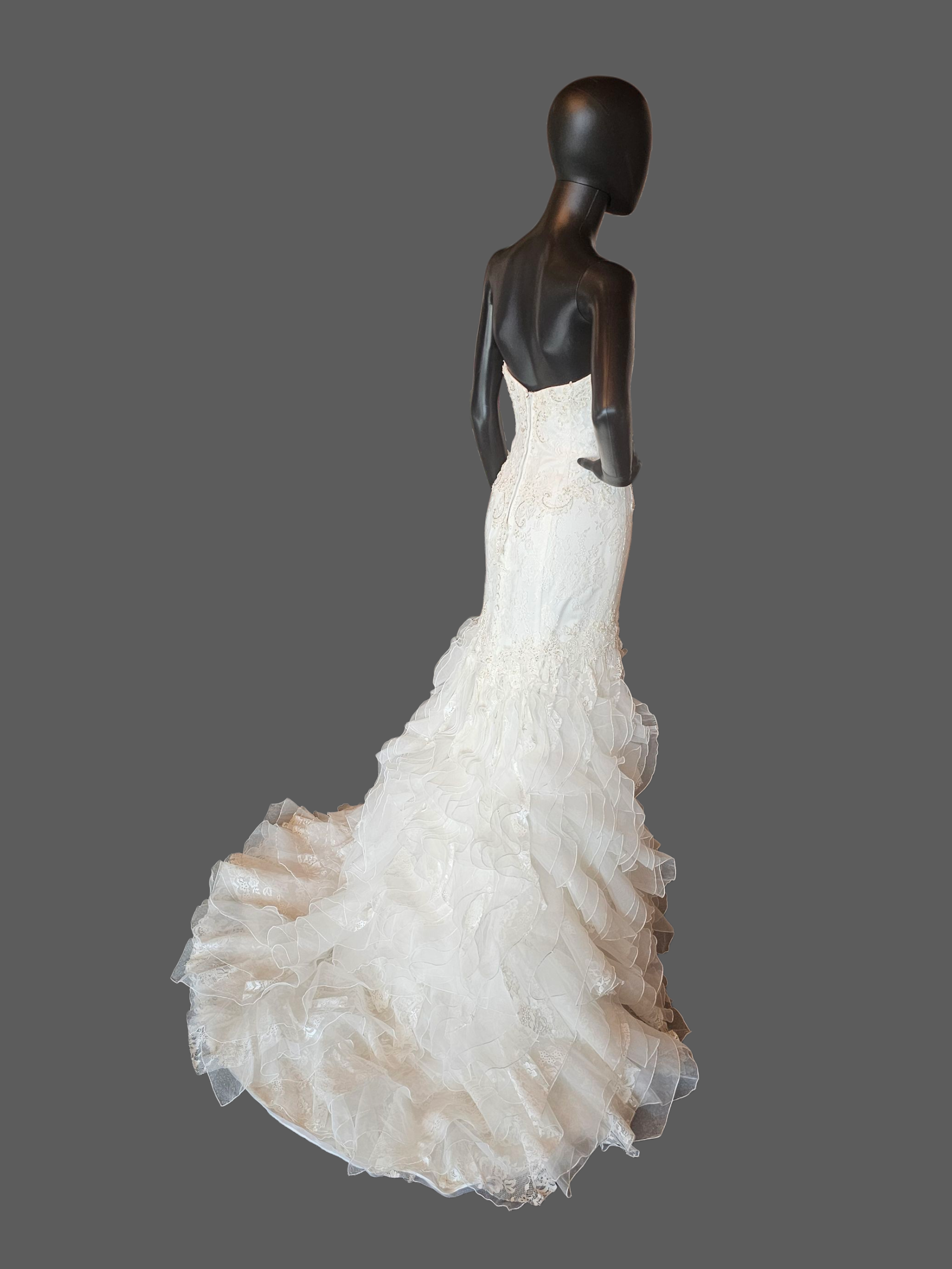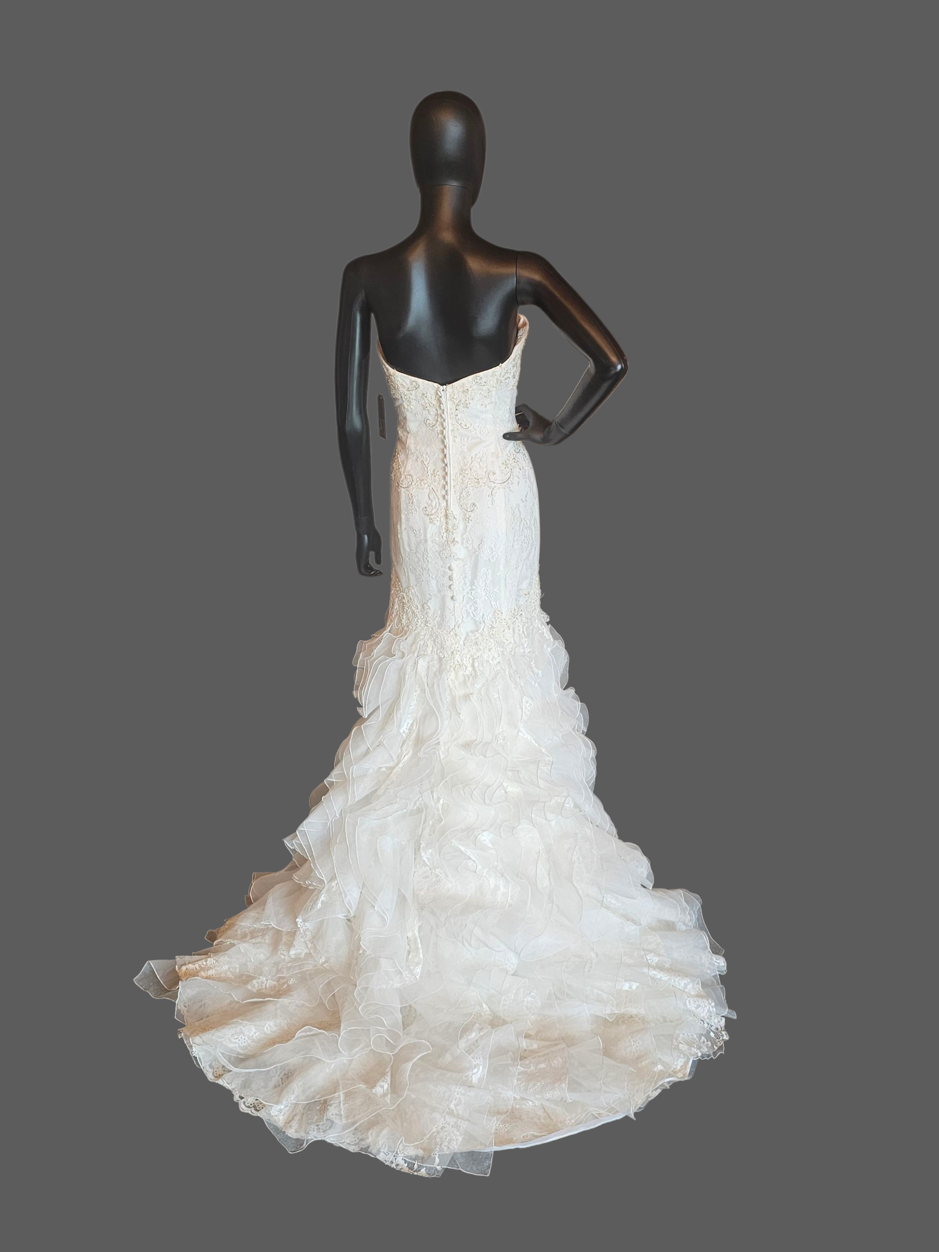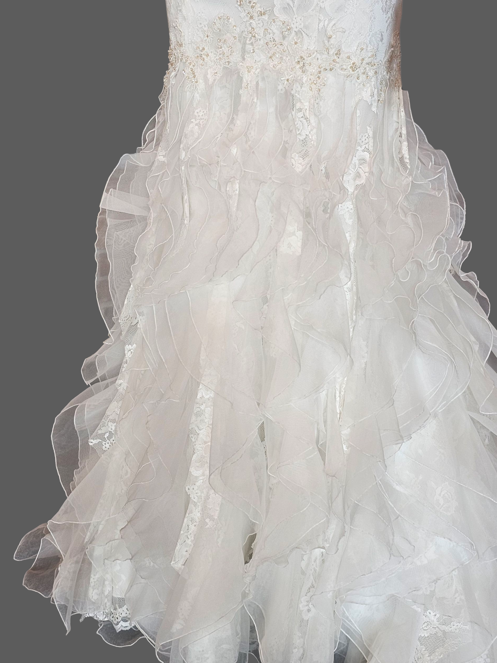 Ivory Lace Strapless Sweetheart Fit/Flare Verticle Ruffle Wedding Gown - Casablanca
