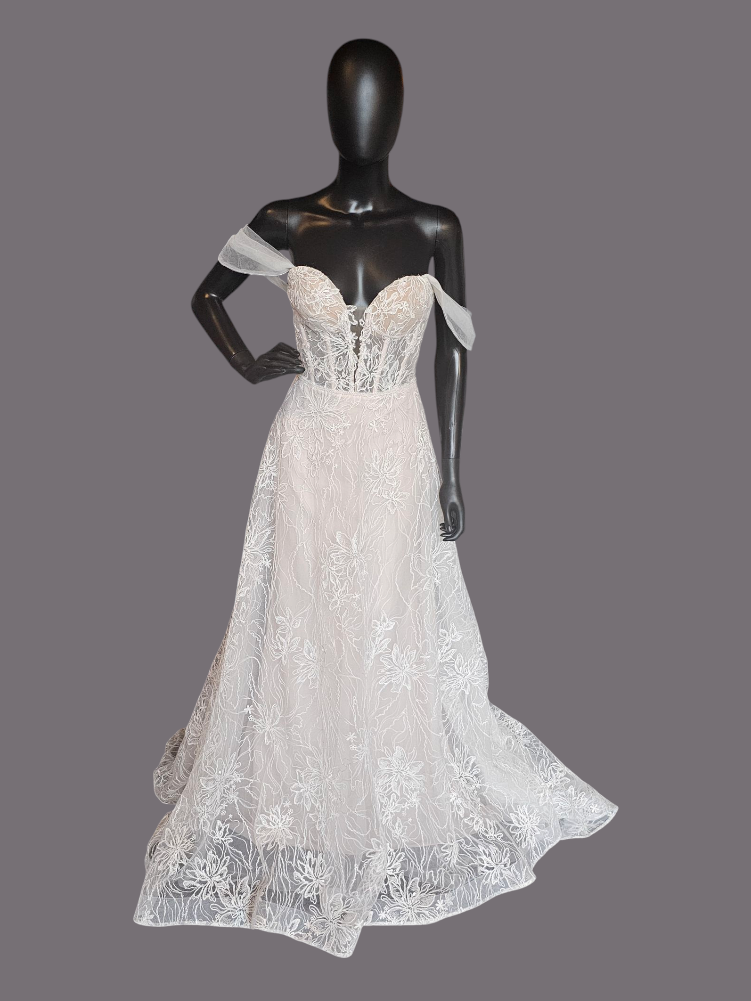 Elevate your wedding day look with our Natural Waist Off Shoulder Vintage Rose Embroidered Wedding Gown. This stunning dress features an illusion bodice with exposed corset boning, delicately embroidered floral details with subtle sequins, and a plunging sweetheart neckline for a touch of allure. The softly sweeping off shoulder removable straps add an elegant and customizable touch to the a-line silhouette. Make a statement on your special day with this one-of-a-kind gown.