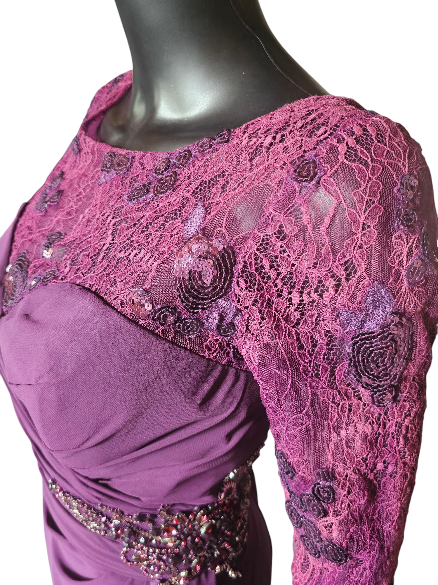 Plum Lace Sleeve Illusion Side Ruched Formal Gown - MGNY