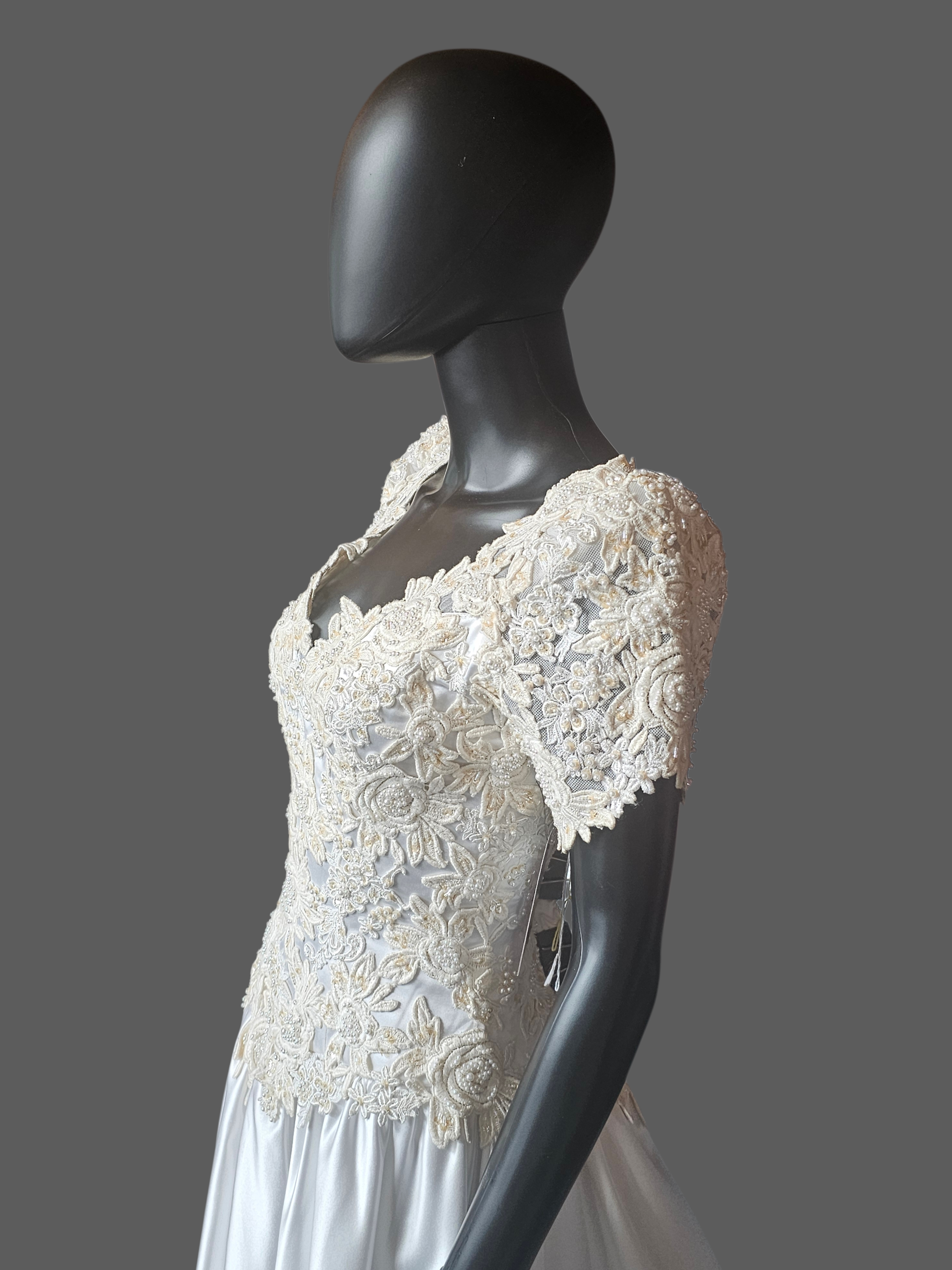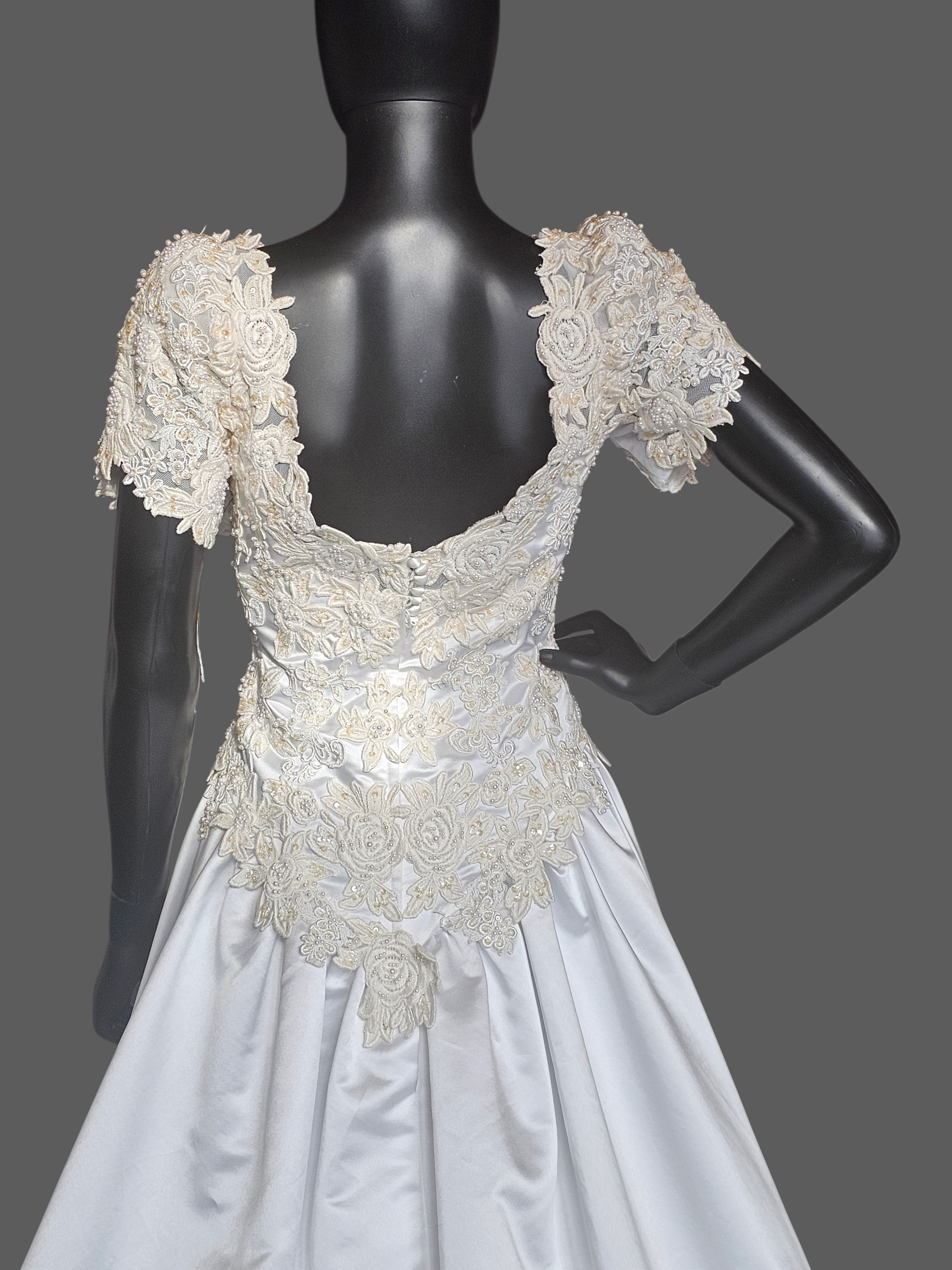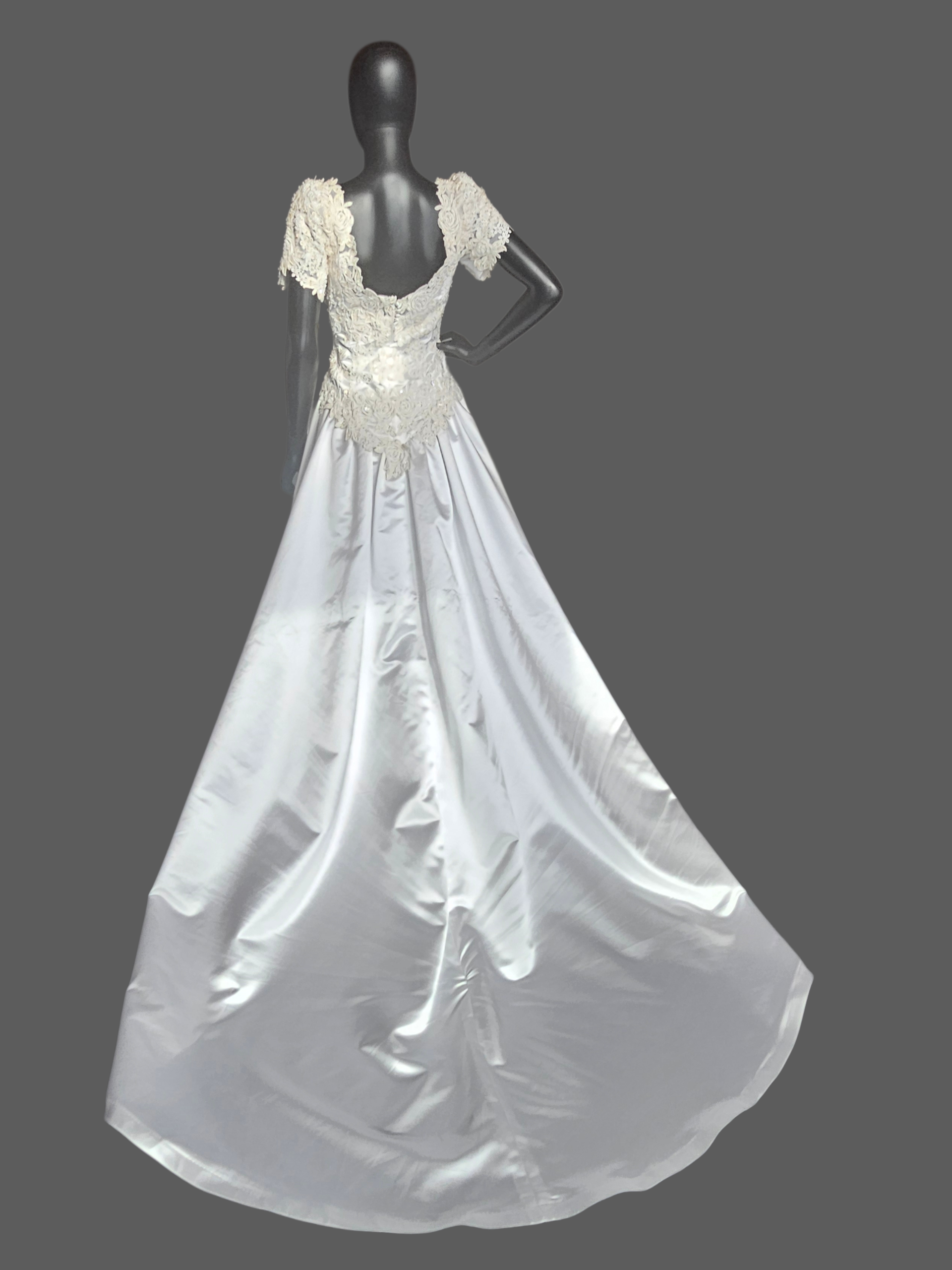 Vintage White Embroidered Cap Sleeve N-Neck Wedding Gown - Modest