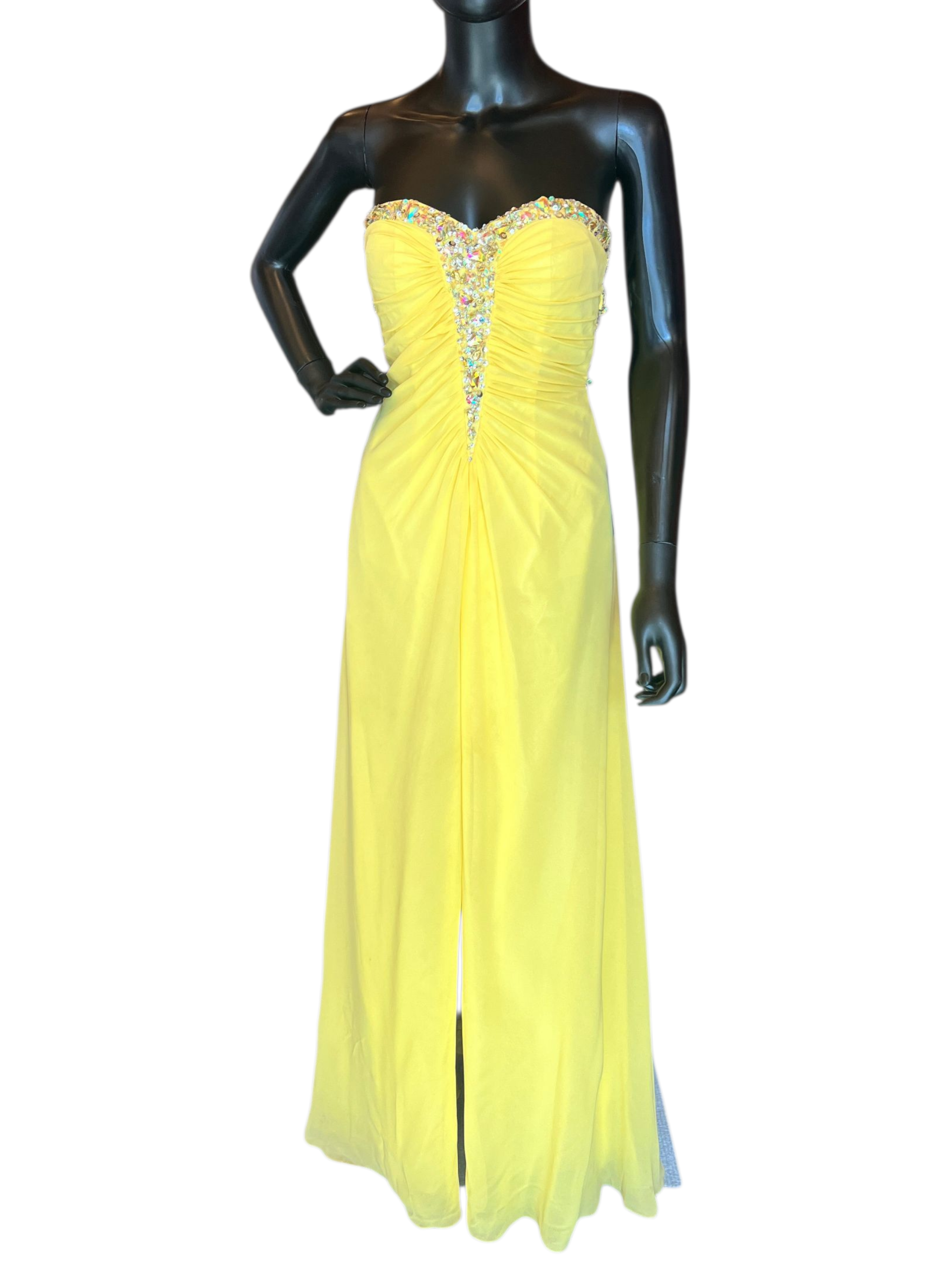 This dress is right out of How to Lose a Guy in 10 Days! The bright yellow is unique and stunning with the stunning strapless design and centered slit. The bust is intricately designed with crystals to accentuate your natural curves, while the loose skirt drapes to the floor in flowy pleats. The true star of the show is the open back with two sparkling straps to secure everything in. This dress is the ultimate mix of comfort and shining style.